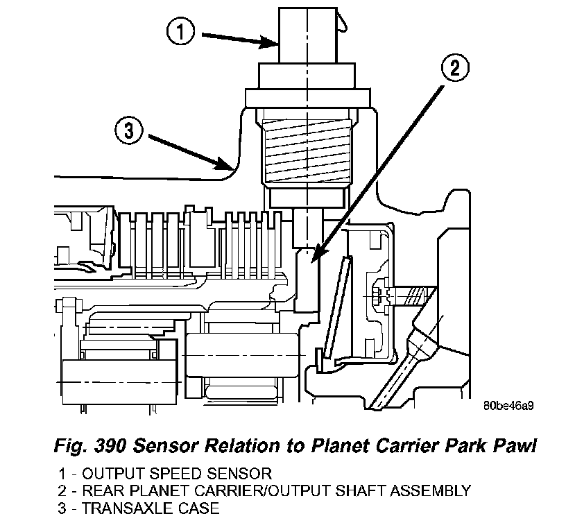The Output Speed Sensor provides information on how fast the output shaft is rotating. As the rear planetary carrier park pawl lugs pass by the sensor coil (Fig. 390), an AC voltage is generated and sent to the PCM/TCM. The PCM/TCM interprets this information as output shaft rpm.