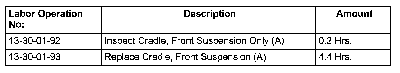 3. Remove and Replace Cradle, Front Suspension. Refer to the detailed removal/installation procedures available in DealerCONNECT > TechCONNECT under: Service Info > 13- Frames and Bumpers > Frame > Engine Cradle Crossmember > Removal/Installation > Front Crossmember.