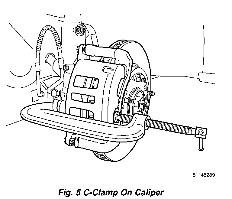 4) Place an appropriately sized C-Clamp over brake caliper as shown (Fig. 5), placing screw-drive head against outboard shoe and hook against rear of caliper. Slowly tighten screw-drive retracting caliper pistons into bores and breaking outboard brake shoe free from caliper fingers. Do not overtighten C-Clamp. Remove C-Clamp.