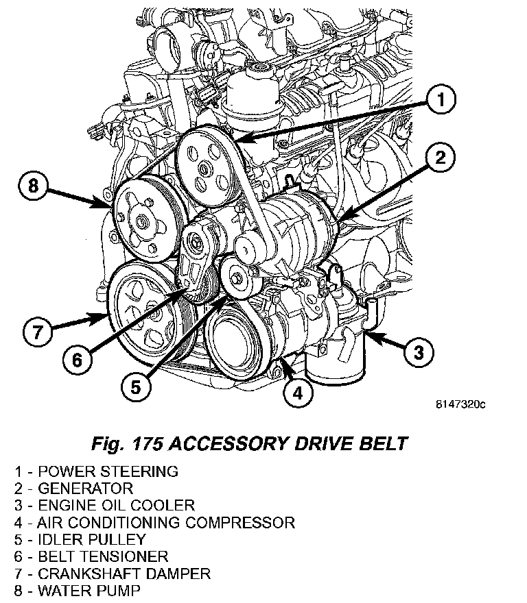 8) Remove power steering pump fasteners and set pump aside (Fig. 175).