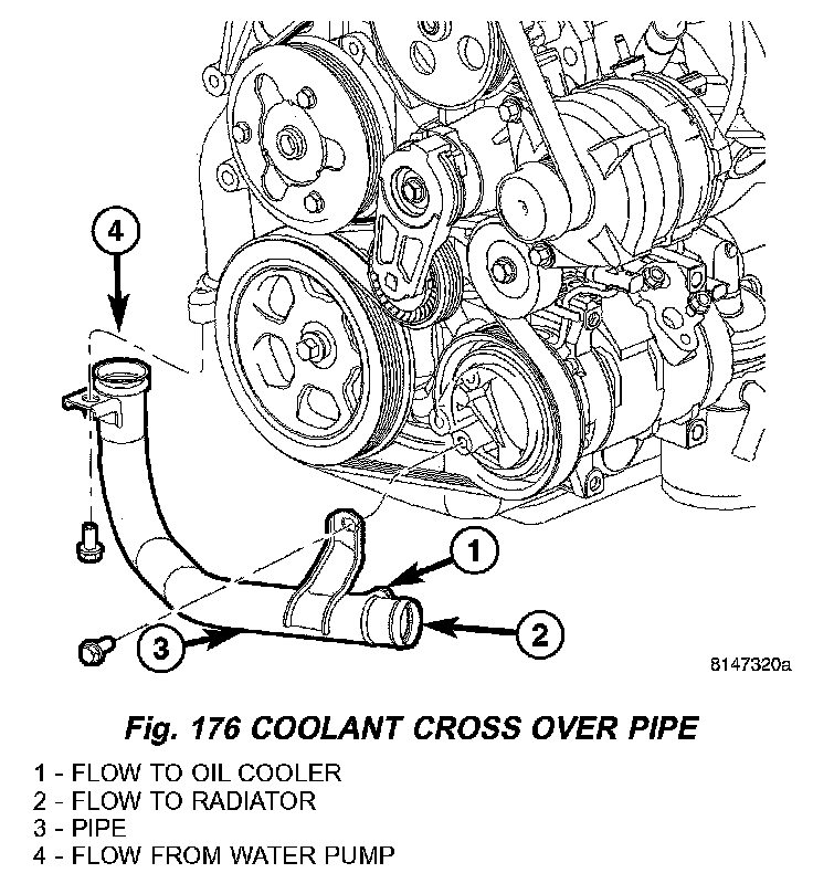 16) Disconnect the lower radiator hose and oil cooler hose at the coolant cross over pipe (Fig. 176).