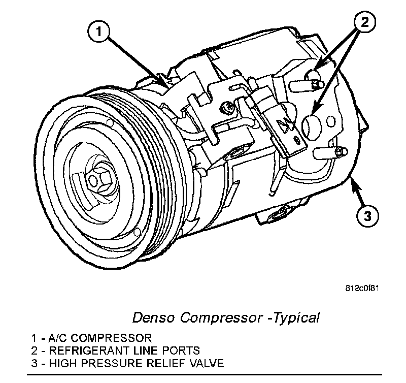 A high pressure relief valve is located on the rear of the A/C compressor. This mechanical valve is designed to vent refrigerant from the A/C system to protect against damage to the compressor and other restriction or an overcharge of refrigerant.