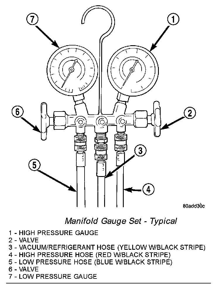 A manifold gauge set may be needed with some recovery/recycling/charging equipment. The manifold gauge set should have shut-off valves, or automatic back-flow valves located at the service port connector end of the manifold gauge set hoses. This will prevent refrigerant from being released into the atmosphere.
