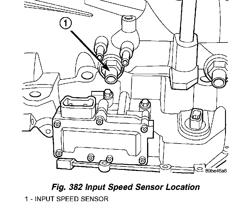 The Input Speed Sensor is a two-wire magnetic pickup device that generates AC signals as rotation occurs. It is threaded into the transaxle case (Fig. 382), sealed with an O-ring (Fig. 383), and is considered a primary input to the Powertrain/Transmission Control Module.