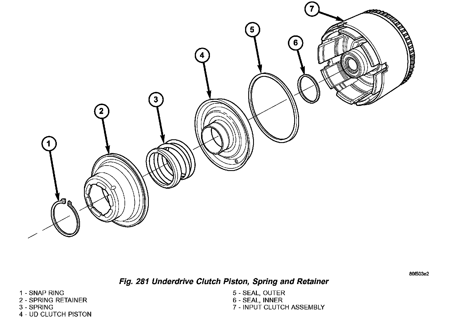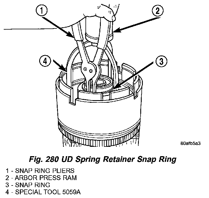 13. Using Tool 5059A and an arbor press, compress UD clutch piston/spring enough to remove snap ring (Fig. 280) (Fig. 281).