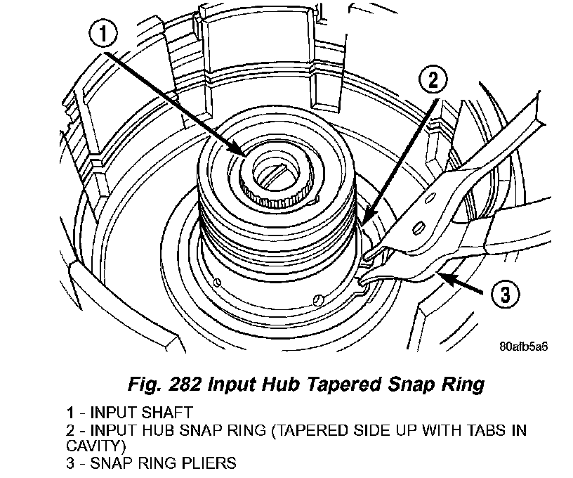 15. Remove input hub tapered snap ring (Fig. 282) (Fig. 288).