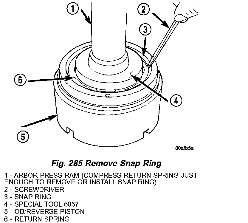 18. Using Tool 6057 and an arbor press, compress return OD/Reverse piston return spring just enough to remove snap ring (Fig. 285).