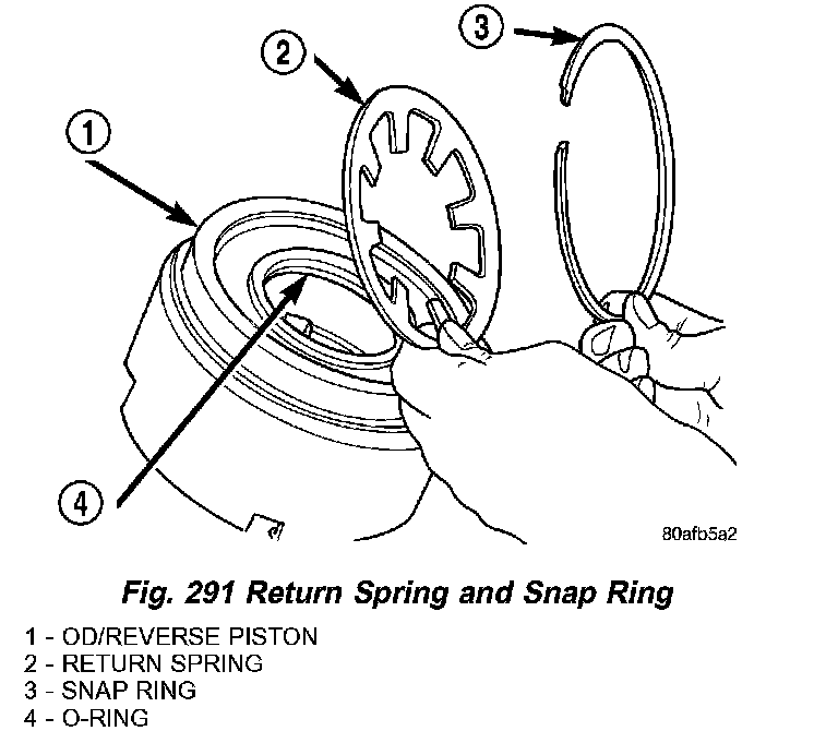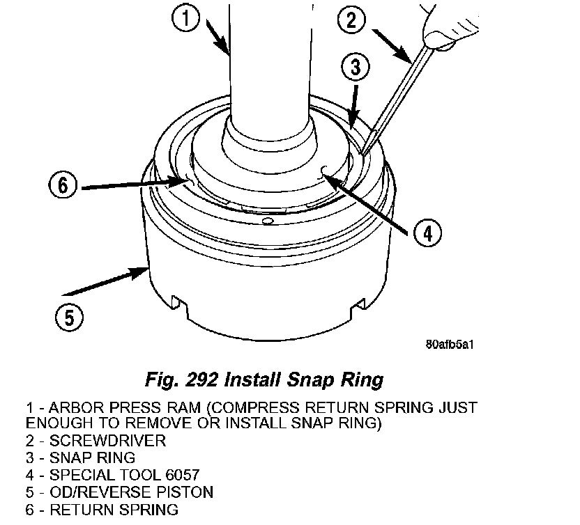 3. Using an arbor press and Tool 6057, Install OD/Reverse piston return spring and snap ring (Fig. 291) (Fig. 292).