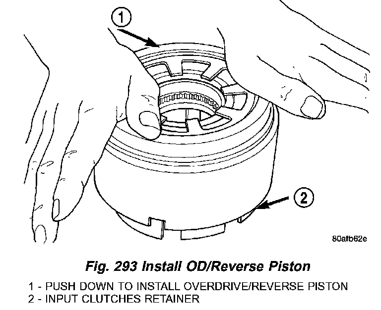4. Install the OD/Reverse piston assembly to the input clutch retainer as shown in (Fig. 293).