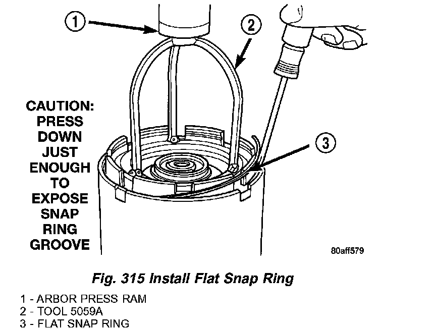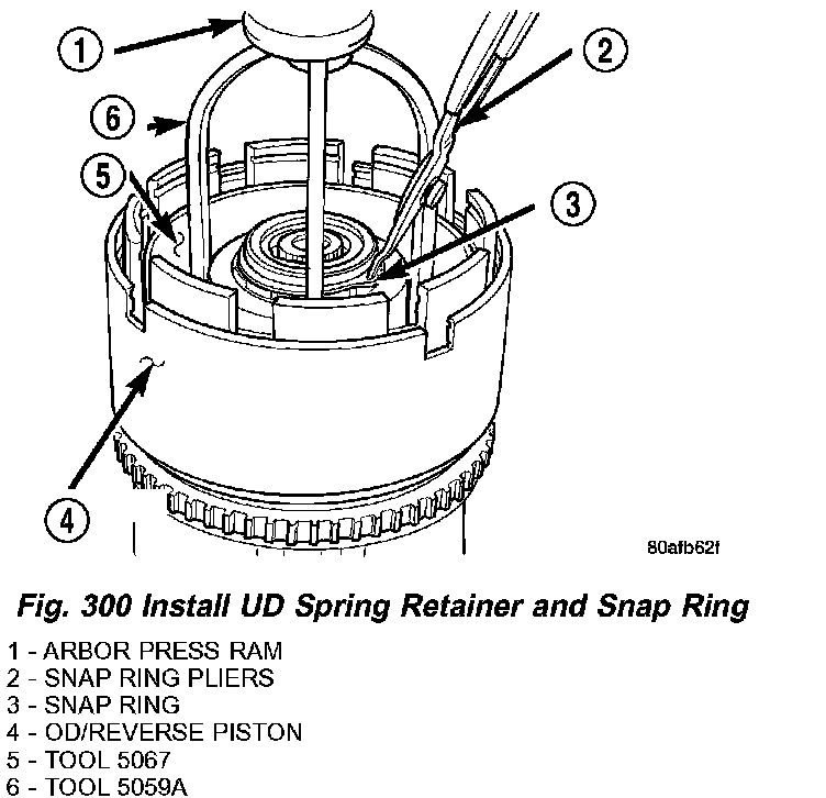 9. Using Tool 5059A and an arbor press, Install the UD spring retainer and snap ring (Fig. 299) (Fig. 300) (Fig. 301) Compress just enough to install snap ring.