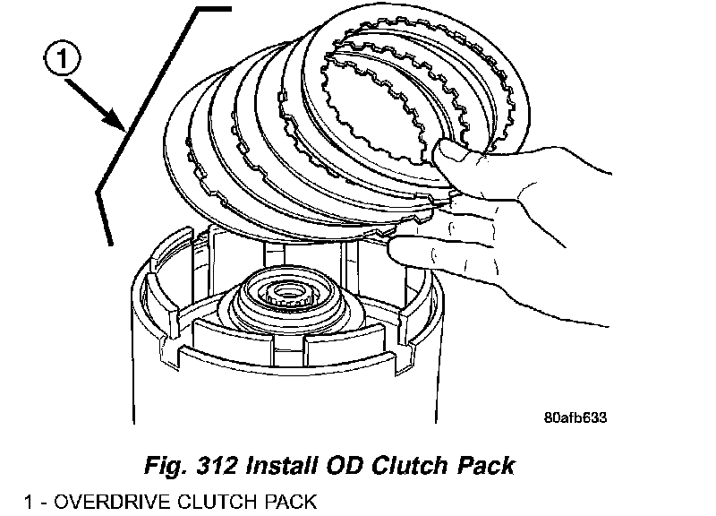 21. Install the OD clutch pack (four frictions/three steels) (Fig. 312).