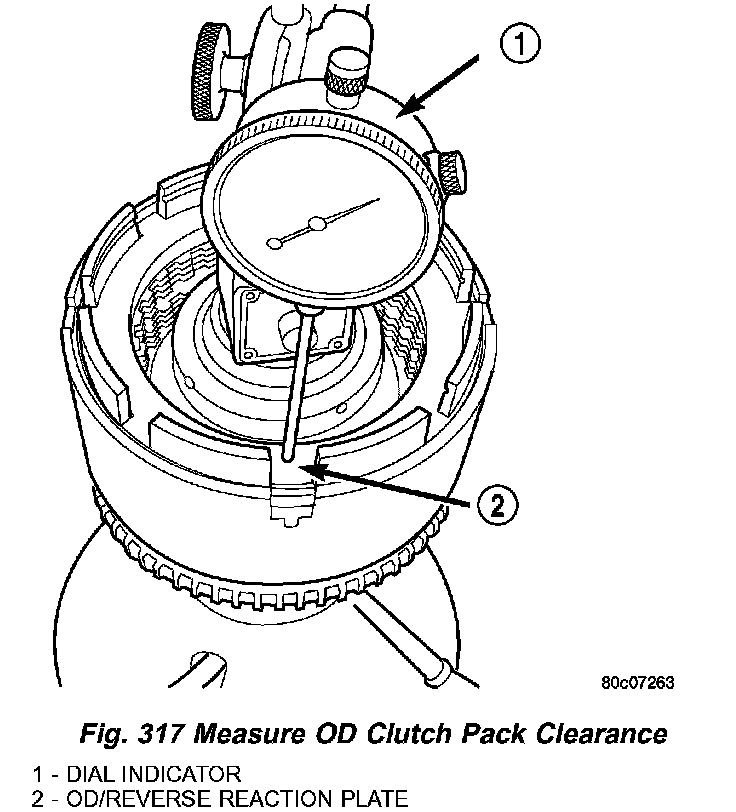 25. Measure OD clutch pack clearance. Set up dial indicator on top of the OD/Reverse pressure plate as shown in (Fig. 317).