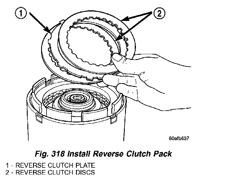 28. Install reverse clutch pack (two frictions/one steel) (Fig. 318).