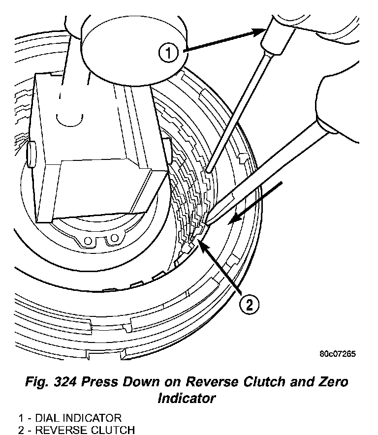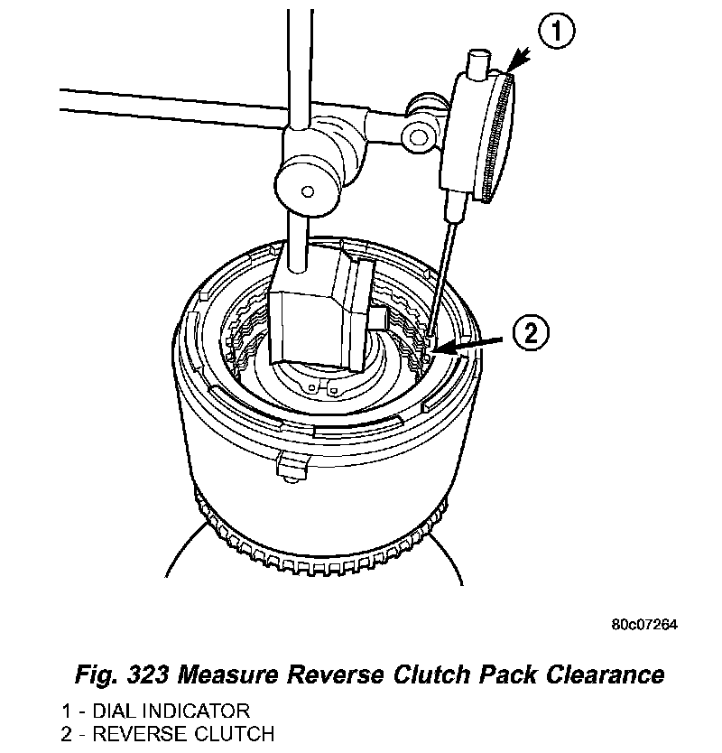 32. Set up a dial indicator on the reverse clutch pack as shown in (Fig. 323).