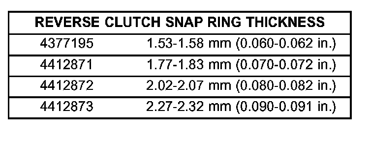 35. Take average of four measurements and compare with reverse clutch pack clearance specification. The reverse clutch pack clearance is 0.89 - 1.37 mm (0.035 - 0.054 inch). Select the proper reverse clutch snap ring to achieve specifications: