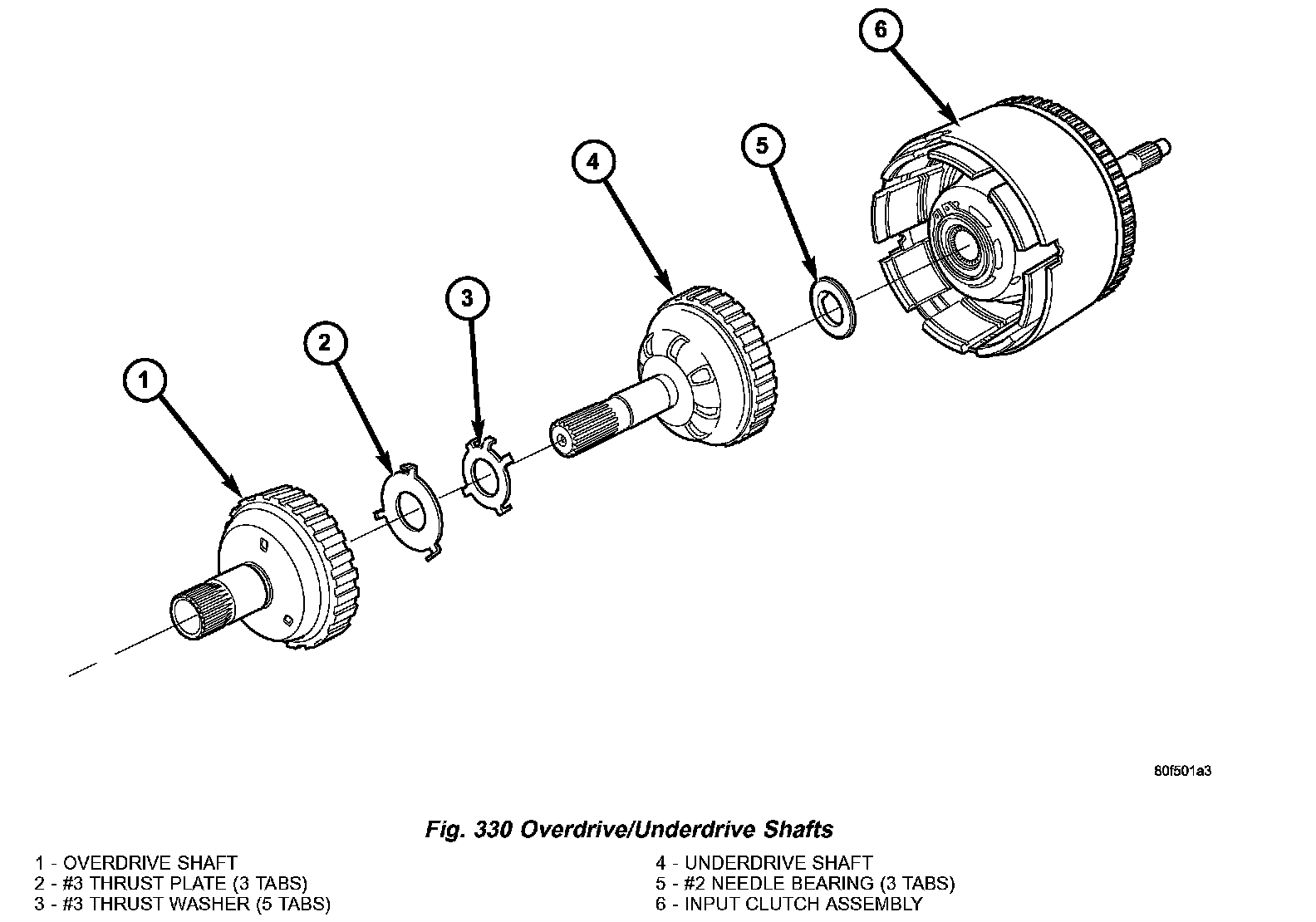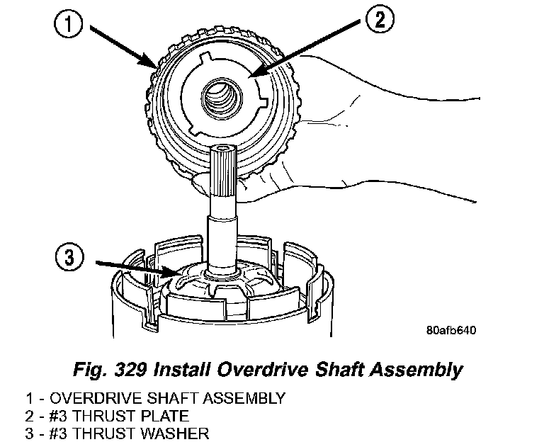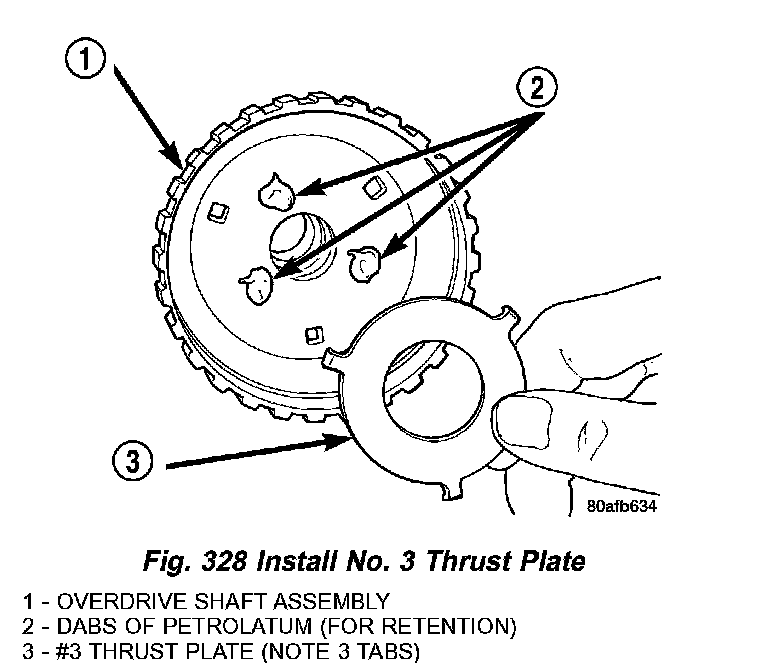 40. Install the #3 thrust plate to the bottom of the overdrive shaft assembly. Retain with petrolatum or transmission assembly gel (Fig. 328).