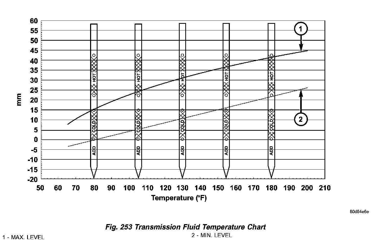 The torque converter fills in both the P Park and N Neutral positions. Place the selector lever in P Park to be sure that the fluid level check is accurate. The engine should be running at idle speed for at least one minute, with the vehicle on level ground. At normal operating temperature 82°C (180°F), the fluid level is correct if it is in the HOT region on the oil level indicator (Fig. 252). The fluid level should be within the COLD region of the dipstick at 27°C (80°F) fluid temperature.