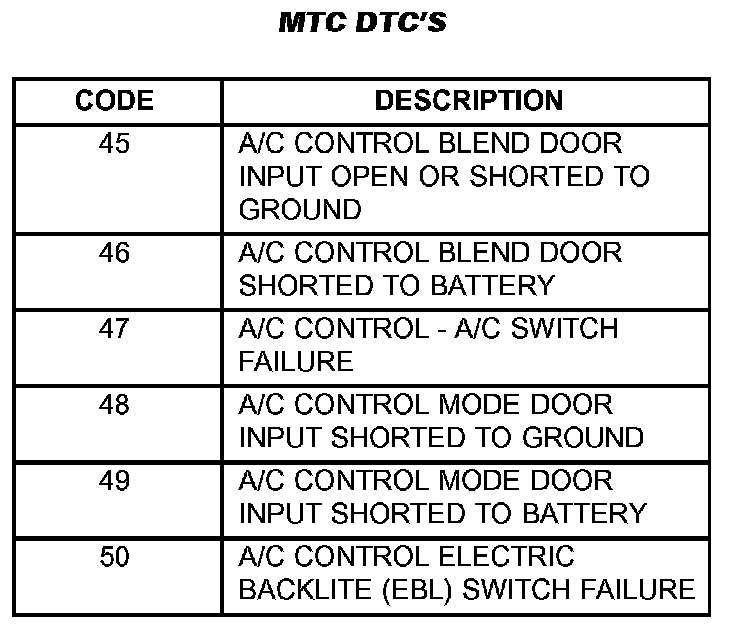There are three DTC tables shown. These DTC tables are to be used when diagnosing the ATC and MTC system using only the vehicles diagnostic display. The DTC's cover operation of the climate control door actuators, ambient temperature sensor, in-car temperature sensor, and the A/C-heater control head. The ATC/MTC DTC table contains faults that are common to both the ATC and the MTC systems. The ATC DTC table covers DTC's that only pertain to only the ATC system and the MTC DTC table has DTC's that pertain to only the MTC system.