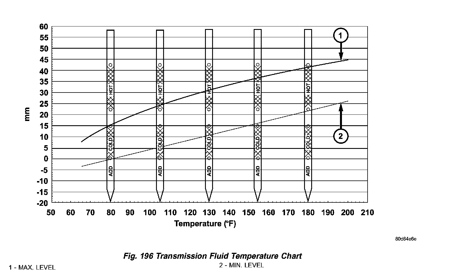 The torque converter fills in both the P Park and N Neutral positions. Place the selector lever in P Park to be sure that the fluid level check is accurate. The engine should be running at idle speed for at least one minute, with the vehicle on level ground. At normal operating temperature 82°C (180°F), the fluid level is correct if it is in the HOT region on the oil level indicator (Fig. 195). The fluid level should be within the COLD region of the dipstick at 27°C (80°F) fluid temperature.
