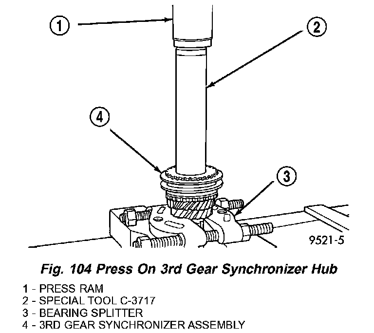 3. Install 3rd gear and 3-4 synchronizer onto input shaft. Install Tool #C-3717 over input shaft and press on synchronizer hub and 3rd gear (Fig. 104). The synchronizer hub has the letter U stamped on the top face of the hub. This designates that the hub must be installed with the U facing upward.