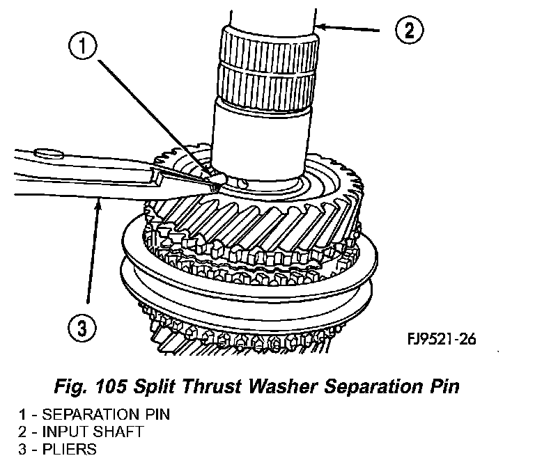7. Install 4-5 split thrust washer separation pin (Fig. 105).