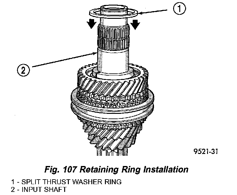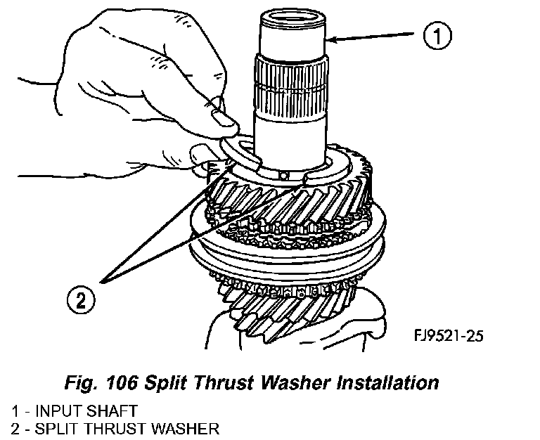 8. Install split thrust washer onto input shaft (Fig. 106).