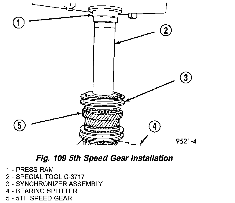 11. Using special tool #C-3717, install 5th speed gear and synchronizer (Fig. 109). The 5th gear synchronizer hub has the letter S stamped on the top face of the hub. This designates that the hub must be installed with the S facing upward.