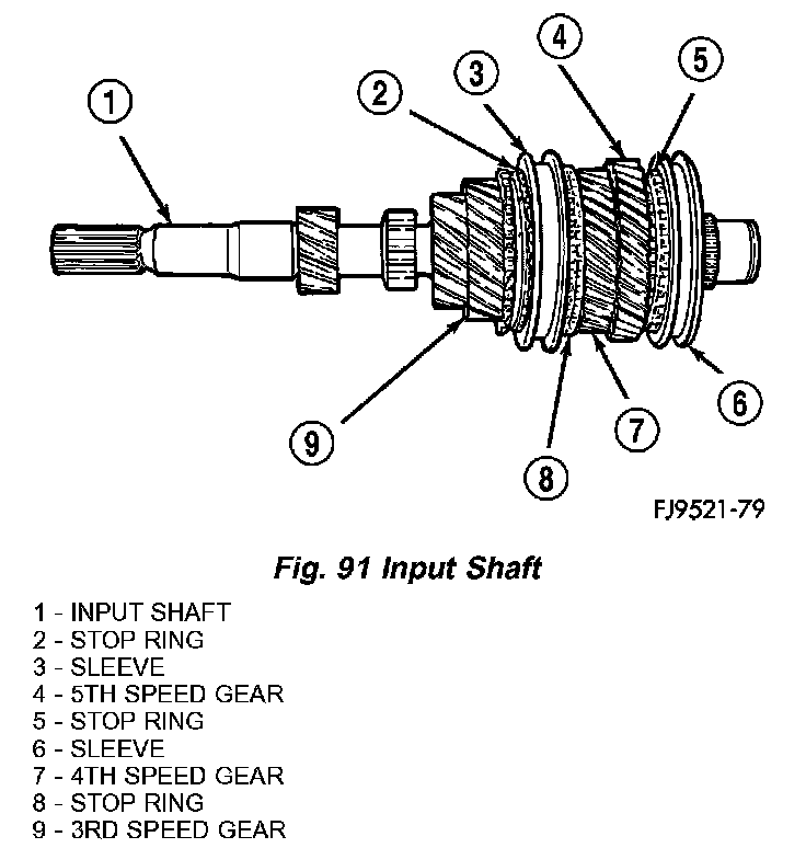 The input shaft incorporates the 3rd, 4th, and 5th speed gears and synchronizers on the assembly (Fig. 91).