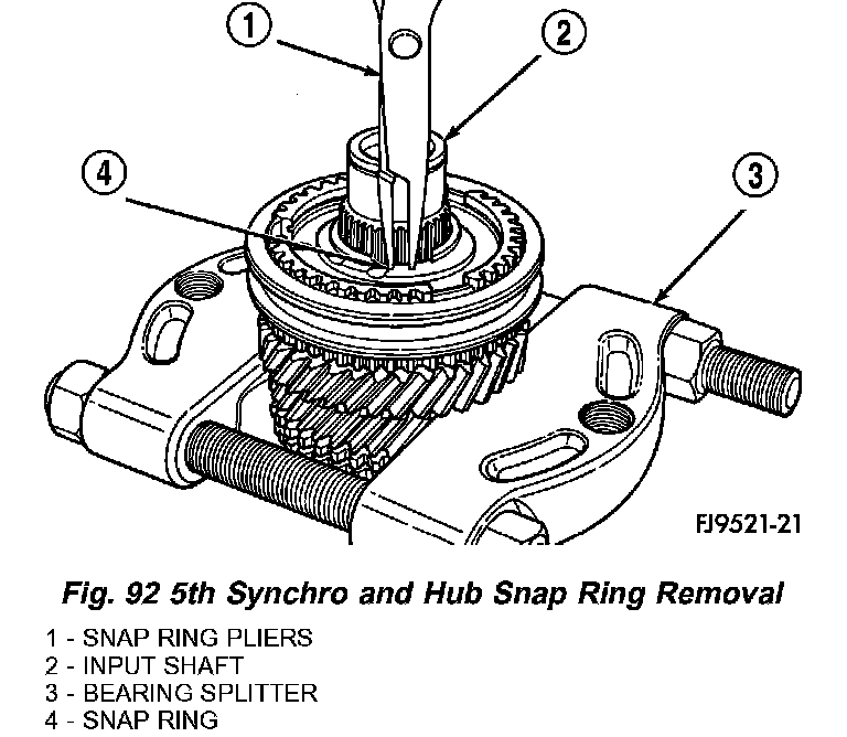 1. Install bearing splitter behind 5th speed gear. Remove snap ring at 5th synchronizer hub on input shaft (Fig. 92).