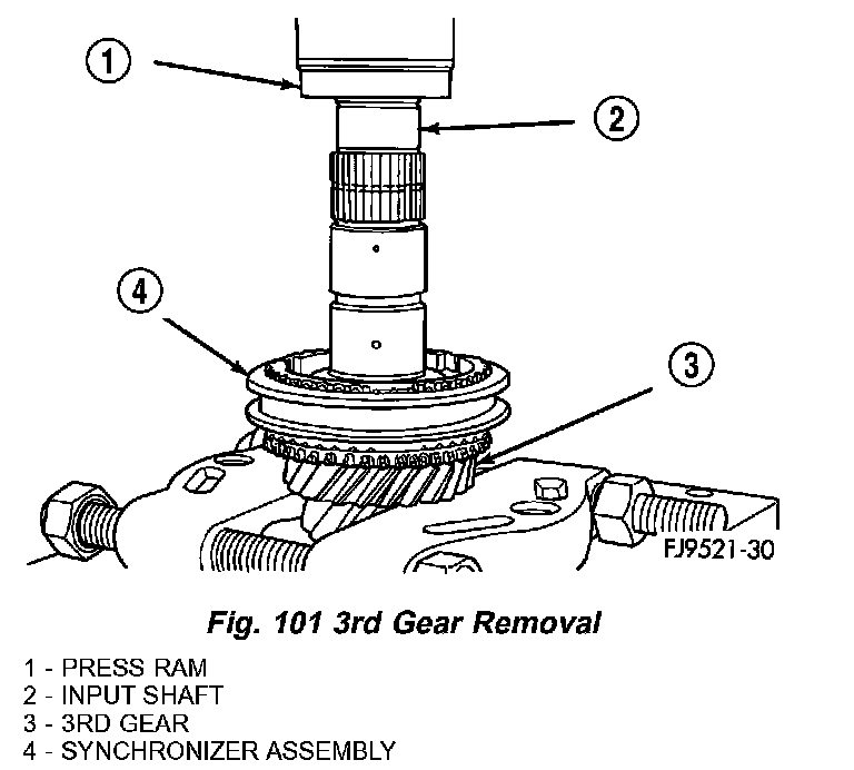 10. Install input shaft in shop press. Using bearing splitter, remove 3-4 synchronizer and 3rd gear (Fig. 101).