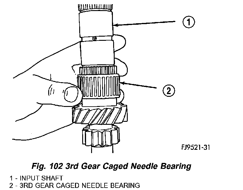 11. Remove 3rd gear caged needle bearing (Fig. 102). Inspect needle bearing for a broken retention spring