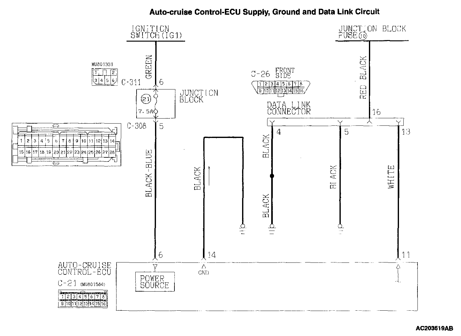 STEP 2. Check auto-cruise control-ECU connector C-21 and Junction block connector C-308 and C-311 for loose, corroded or damaged terminals, or terminals pushed back in the connector.