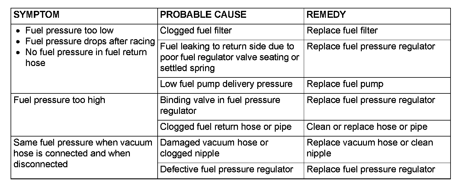 12. If any of fuel pressure measured in steps 10 to 13 is out of specification, troubleshoot and repair according to the table below.