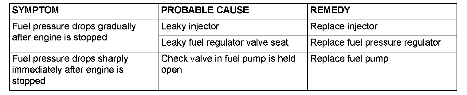 13. Stop the engine and observe fuel pressure gauge reading. It is normal if the reading does not drop within two minutes. If it does, observe the rate of drop and troubleshoot and repair according to the table below. Start, then stop the engine.