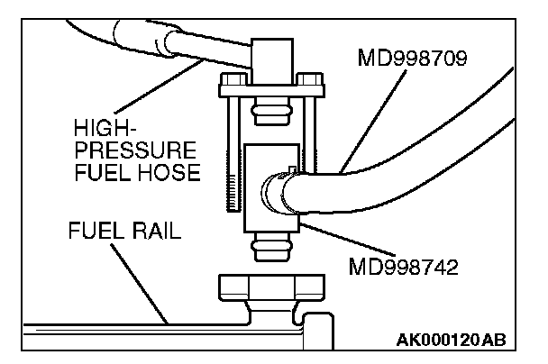 15. Remove the fuel pressure gauge, and special tools MD998709 and MD998742 from the fuel rail.