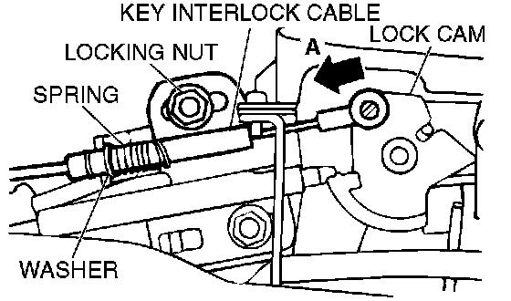 4. Lightly push the key interlock cable into the key interlock cable housing toward the arrow (A) direction until the cable movement stops and the cable end eye is aligned with the shaft on the lock cam. Tighten the locking nut. Snap the cable end eye onto the shaft of the lock cam.