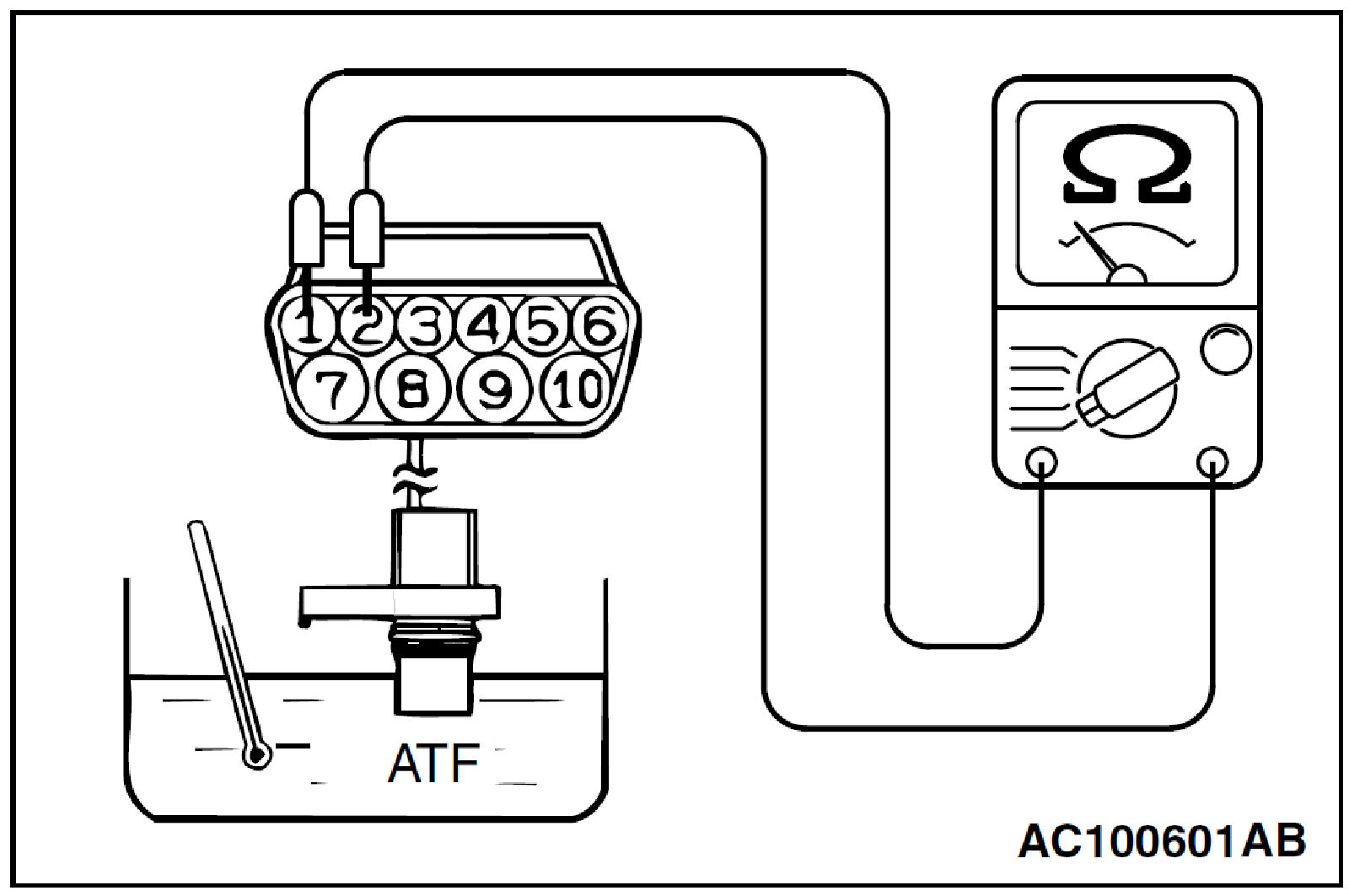 2. Measure the resistance between terminals 1 and 2 of the transmission fluid temperature sensor connector.