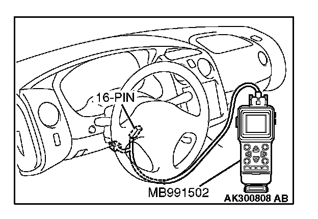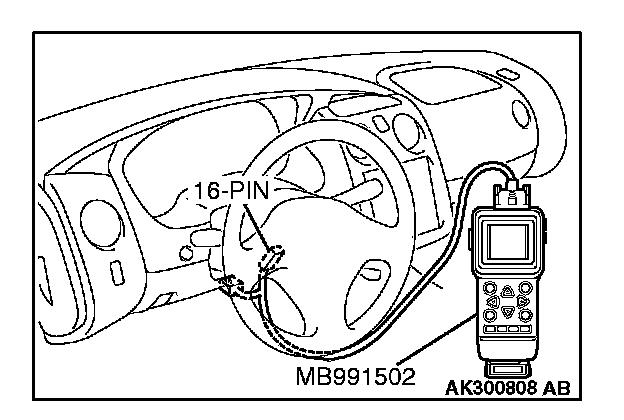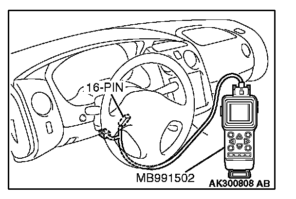 CAUTION: To prevent damage to scan tool MB991502, always turn the ignition switch to the "LOCK" (OFF) position before connecting or disconnecting scan tool MB991502.