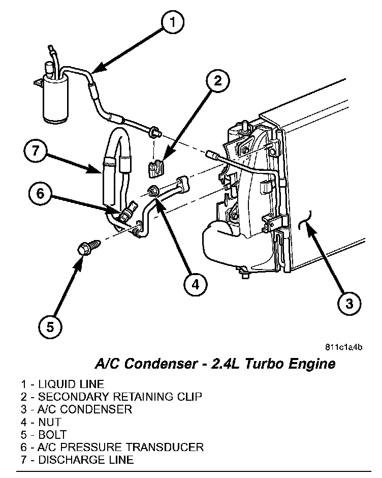 NOTE: If the A/C condenser is being replaced, add 30 milliliters (1 fluid ounce) of refrigerant oil to the refrigerant system. Use only refrigerant oil of the type recommended for the A/C compressor in the vehicle.
