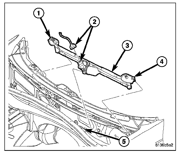 5. Remove the two retaining bolts (1 and 4) and remove wiper module (3) from vehicle.