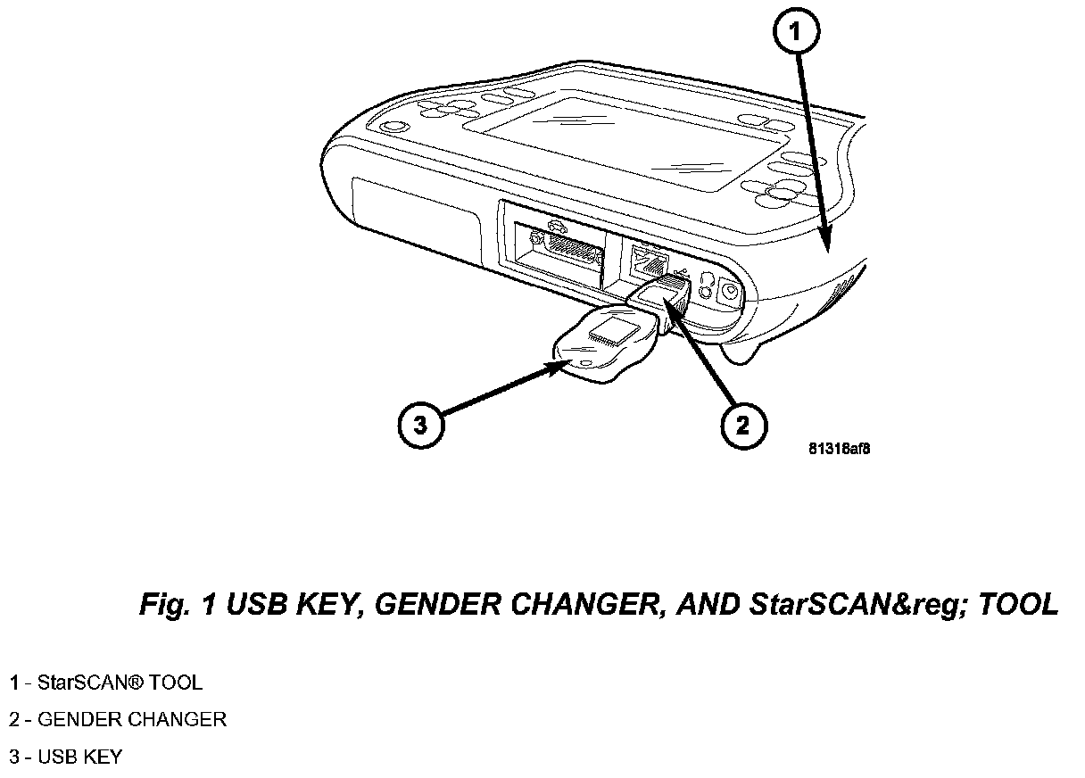 10. With the StarSCAN(R) powered OFF, connect the USB Key and Gender Changer to the StarSCAN(R) USB port (Fig. 1).