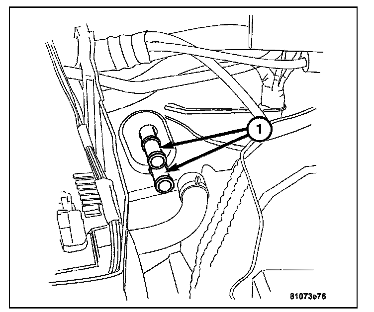 25. Install the hot water hose (1) the install the hot water hose clamp located inboard to the brake booster on the bulkhead.