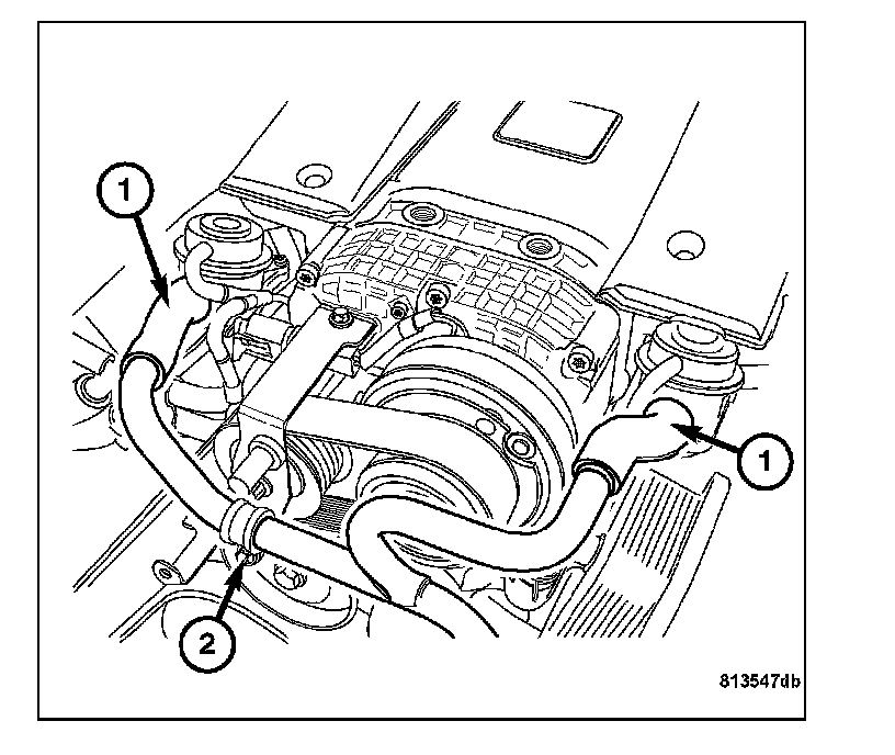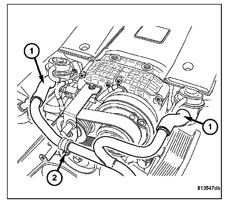 7. Remove the supercharger idler pulley upper retaining bolt (1) and lower retaining bolt (2).