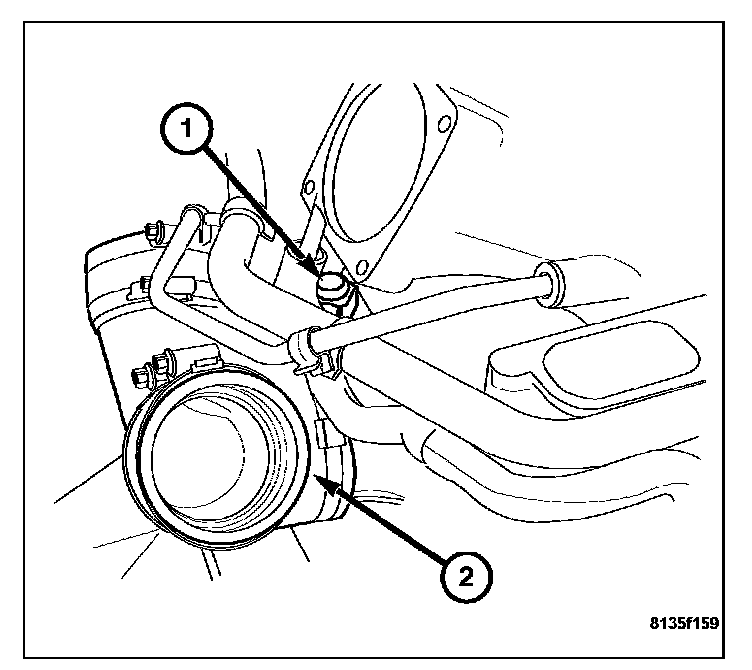 7. Remove the supercharger outlet housing (2) by removing the supercharger outlet housing hose clamps.