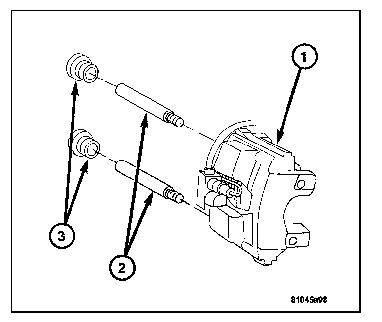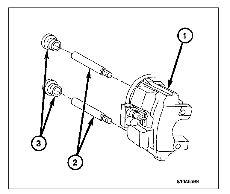 2. Lubricate the slide pins (2) and slide pin caps with silicone grease.