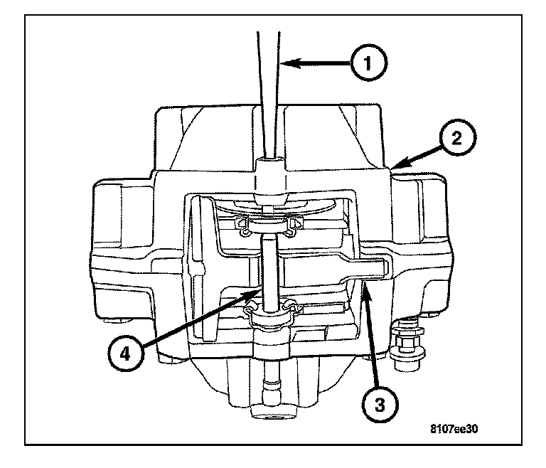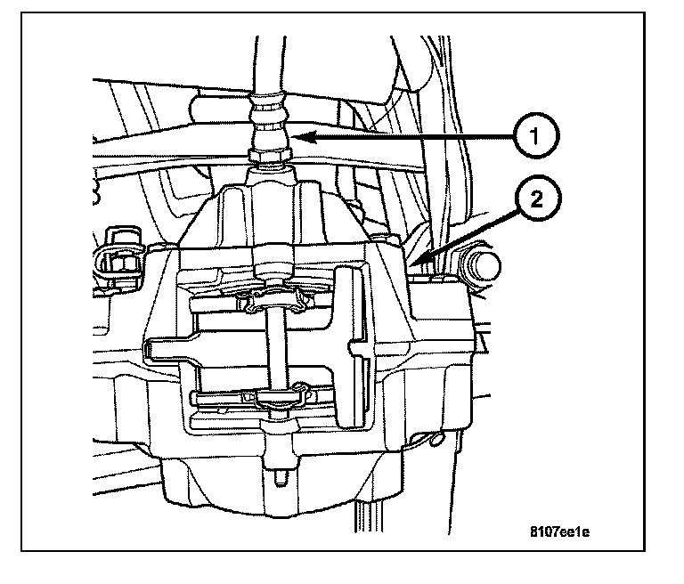 4. Install the brake hose (1) to caliper (2) by holding the brake hose (1) with a wrench and rotating caliper (2) until snug. Fully tighten the brake hose after the caliper is installed.