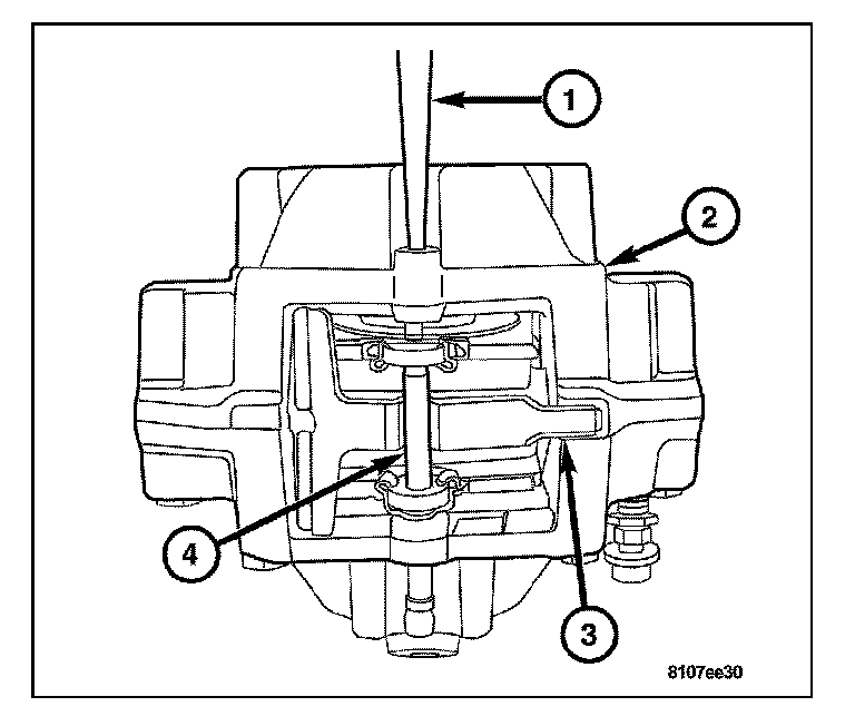 3. Install the retaining pin (4) through the hole in the side of the caliper (2). Tap the pin (4) into the caliper (2) until it is threaded through both brake pads and over the anti-rattle clip (3).