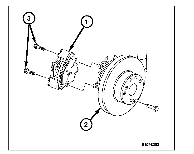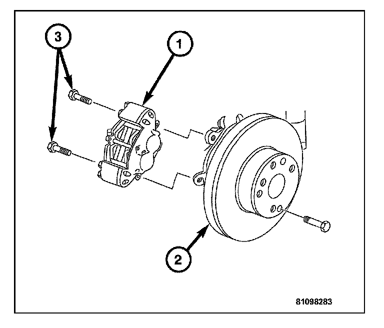 4. Remove the caliper bracket mounting bolts (3) and remove the caliper (1) and bracket as an assembly from the steering knuckle (2).
