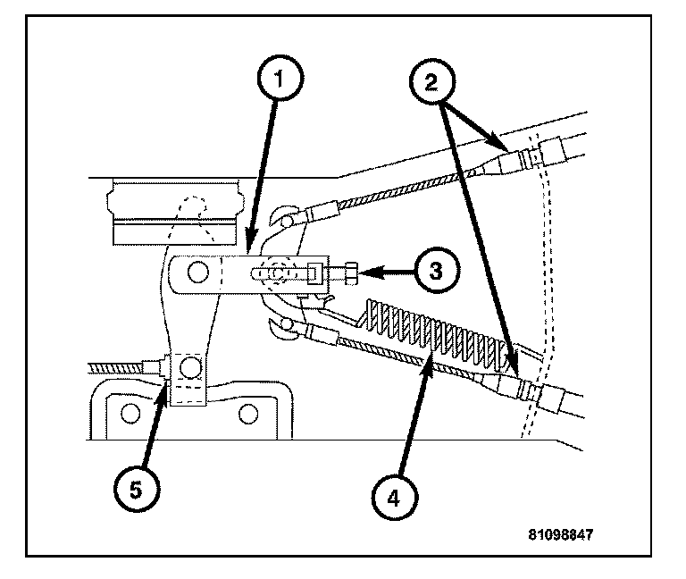 6. Tighten the parking brake cable tensioning bolt (3) until the parking brake cables (2) no longer sag.