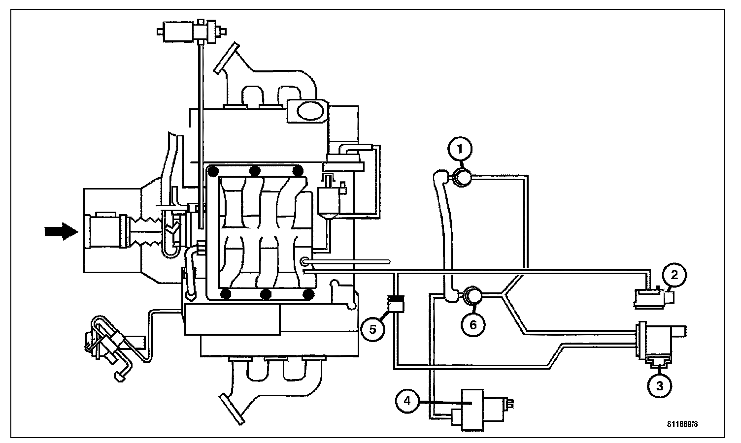 This vehicle is equipped with an Air Pump that injects air into the exhaust to reduce the emissions during engine warm-up. The air injected into the exhaust will cause the catalytic converters to heat up more quickly. This will improve the emission levels during a cold start. The Air Pump Switchover System incorporates an Air Pump (4) with two Air Pump Switchover Valves (1 and 6), an Air Pump Switchover Solenoid (3), an Air Pump Relay, a Vacuum Check Valve (5) and the PCM.